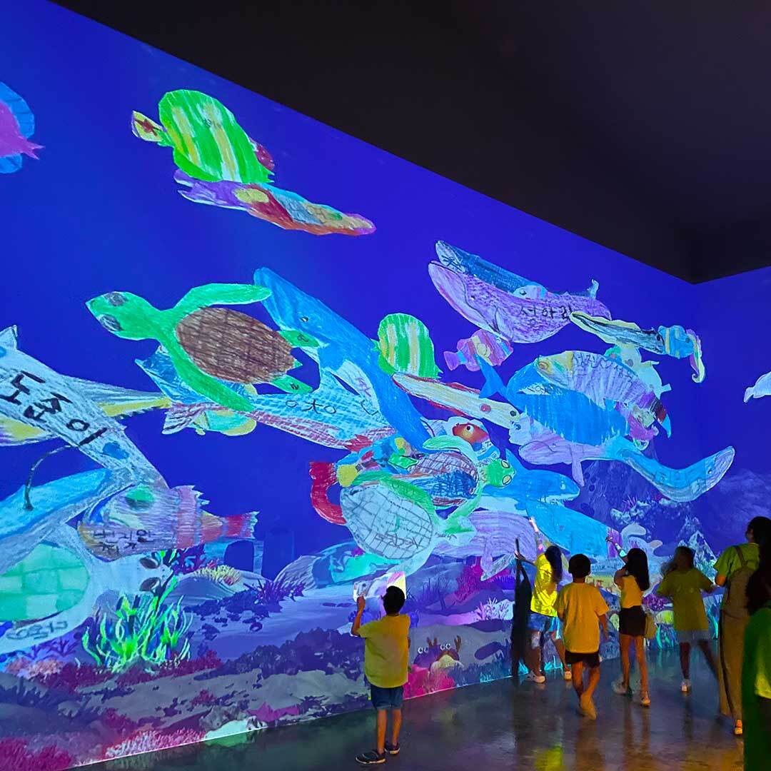 아이들이 그린 그림이 거대한 미디어 벽에서 움직입니다. 단순한 감상을 넘어, 직접 미디어 아티스트가 되어보는 인터랙티브 체험이 가능해요. 어린이들에게는 가장 인기 많은 존 중 하나랍니다.