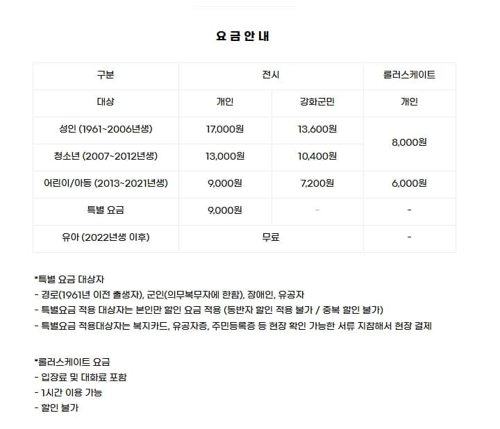 - 입장권: 전시관 별도 구매 / 롤러스케이트장 별도 운영