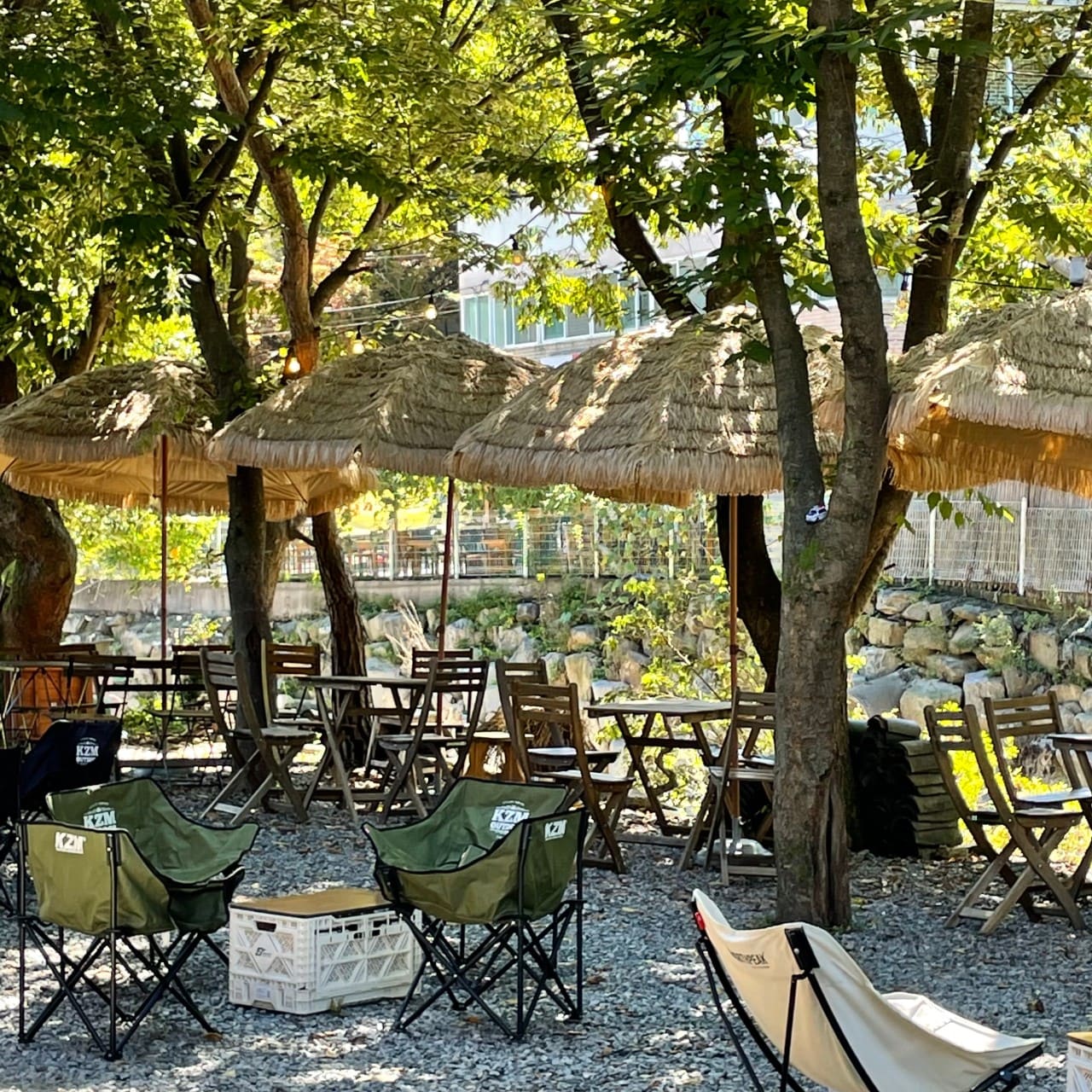 넓은 개울가에 놓여있는 야외 좌석에서 시원한 남한산성 뷰를 즐길 수 있고 계곡에 발도 담가볼 수 있어요.