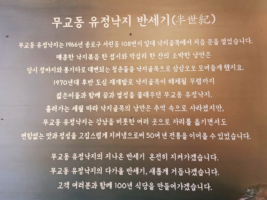 무교동 유정낙지는 1970년대 초부터 현재까지 중구 무교로에서 자리를 지켜온 서울의 대표적인 전통 맛집입니다.
