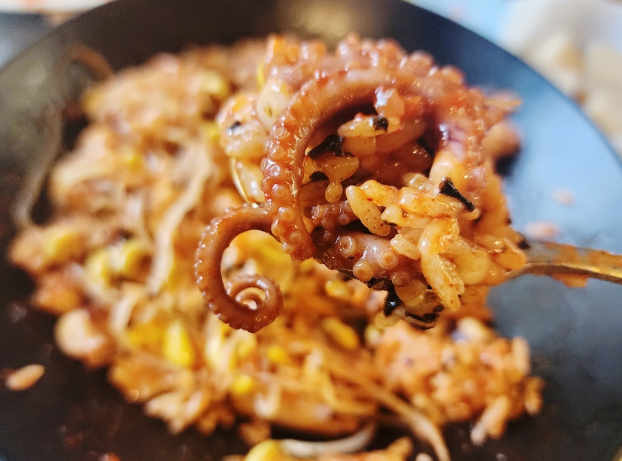 통통한 낙지에 자극적이지 않으면서 매콤한 양념이 잘 어우러지는 맛인데 혀를 자극하는 얼얼하고 자극적인 매운맛이 아니고 은근하게 매운 그런 맛으로 중독성이 있는 매운맛입니다.