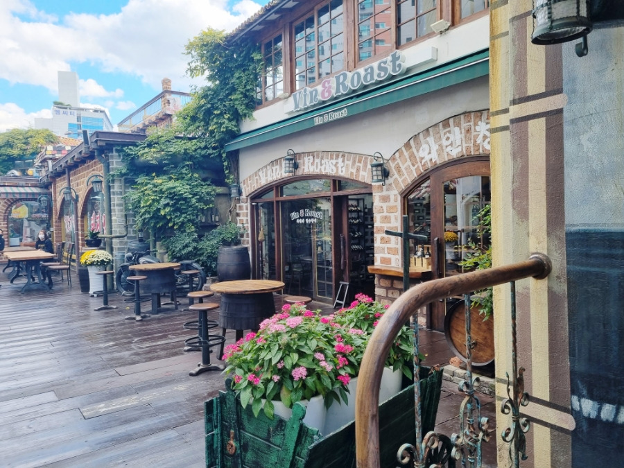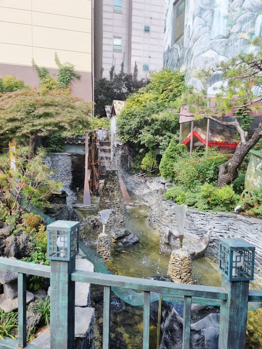 분수와 다양한 테이블이 설치되어 있어서 식사후 모여서 커피 마시며 담소나누기 좋은 장소입니다.