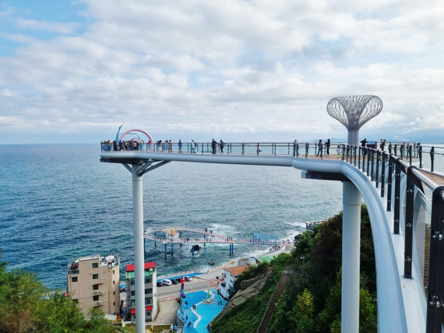 도째비골 스카이워크는 삼척의 대표적인 스릴 명소! 투명 유리 바닥 위로 탁 트인 바다를 바라보며 짜릿한 경험을 할 수 있습니다.
