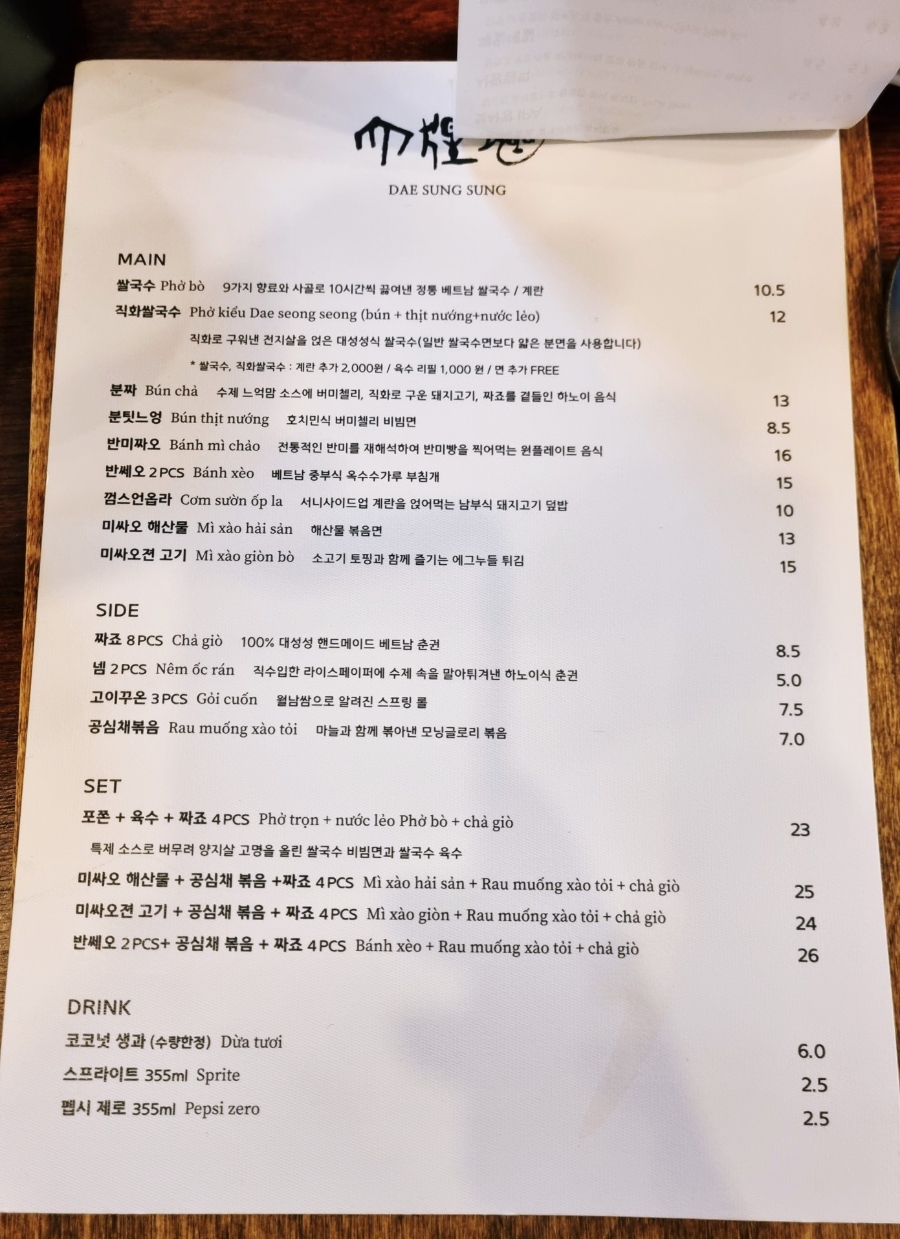 ‘대성성’은 쌀국수, 분짜, 반쎄오 등 베트남 대표 요리를 주로 다루며, 가격대는 9,500원~15,000원 선으로 합리적인 편입니다.