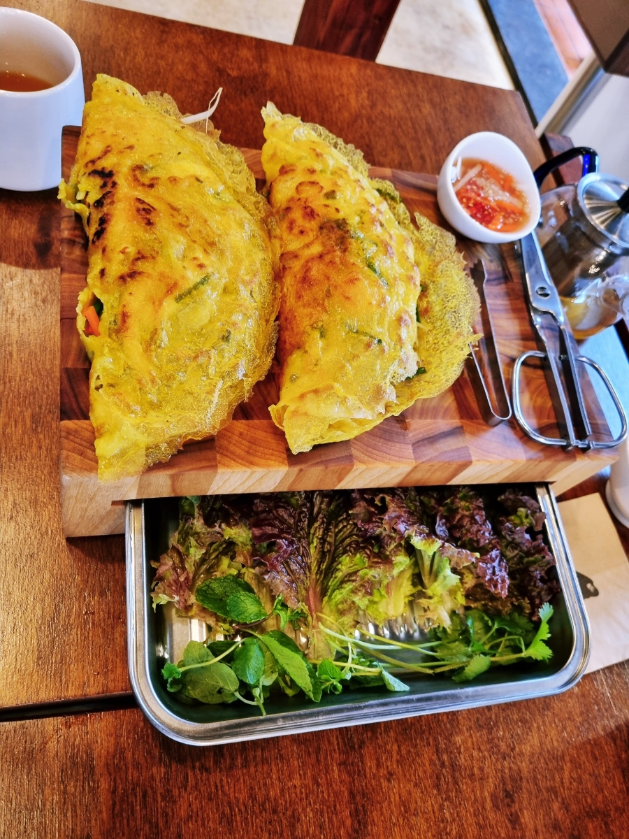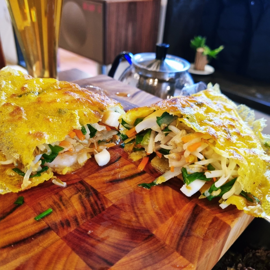 여행 프로그램에서 반쎄오 먹는 게 많이 나와서 궁금했는데 먹어보는 건 처음이었는데, 옥수수 전분이라 노란빛을 띠고 엄청 바삭하고 맛있습니다.