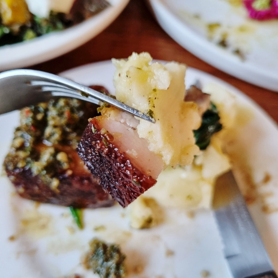 꼬숑 콩피는 저온에서 오래 익힌 돼지고기 요리인데, 겉은 바삭하고 속은 정말 부드러워요.