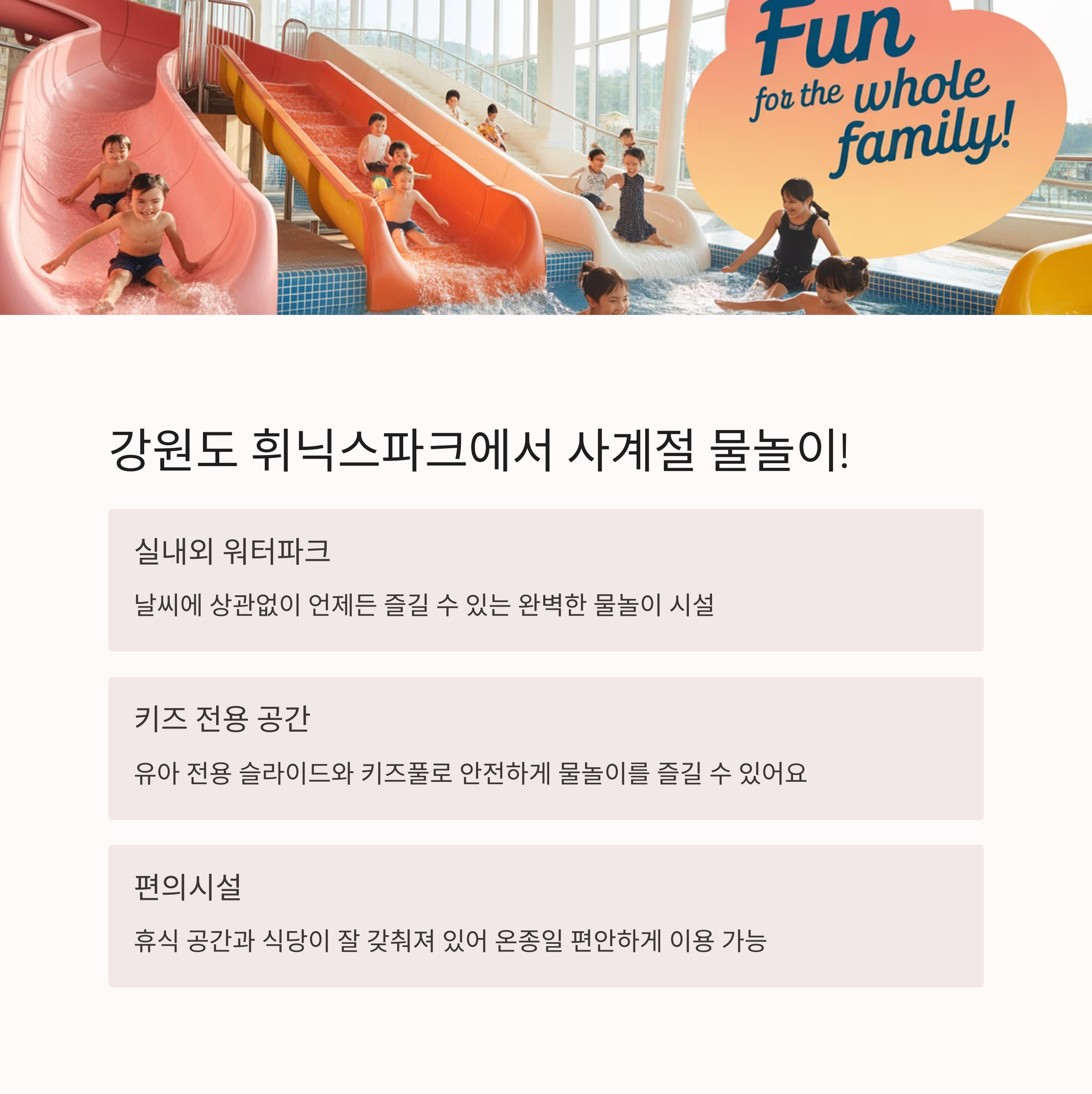 특히 키즈 풀과 유아 전용 슬라이드는 부모님이 안심하고 놀 수 있게 구성돼 있어서 아주 만족도가 높아요.