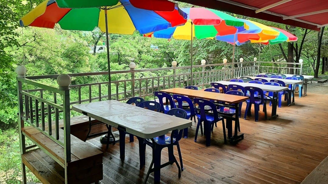 특징: 숲속 글램핑 분위기의 계곡식당으로, 계곡 바로 옆 평상이 인상적입니다.