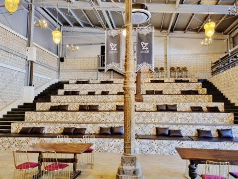 두 번째 공간으로 넘어가면 엄청 넓은 계단식 좌석이 나오고, 테이블도 멋지게 세팅되어 있어요.
