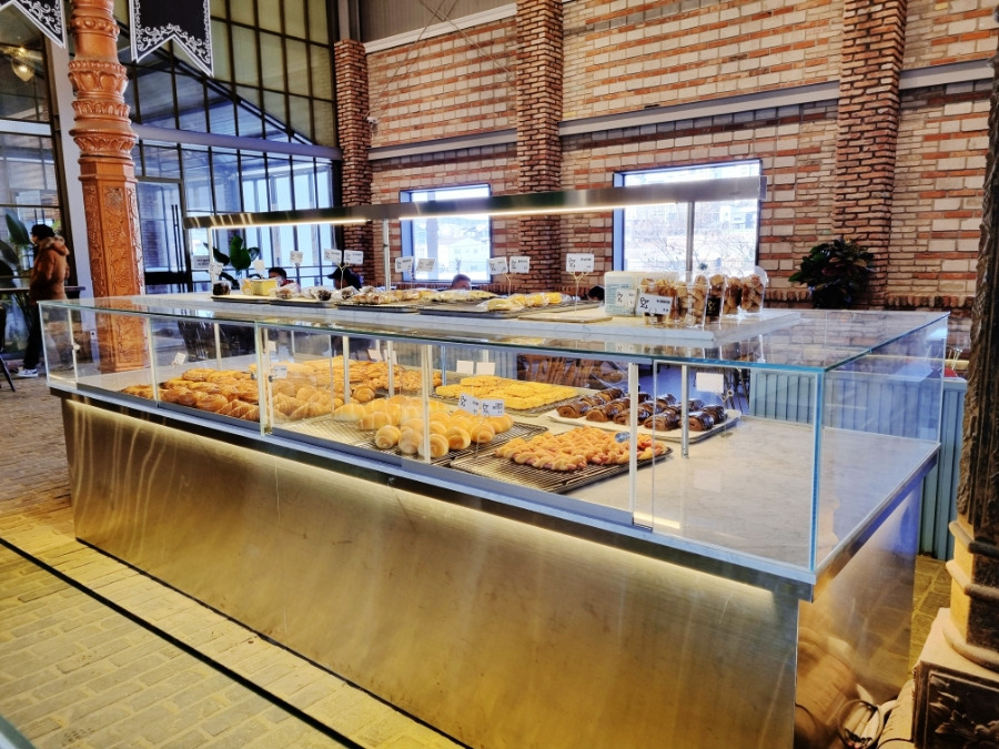 가운데는 베이커리 진열대가 있는데, 빵들이 케이스 안에 있고 문도 달려있어서 위생적이네요.