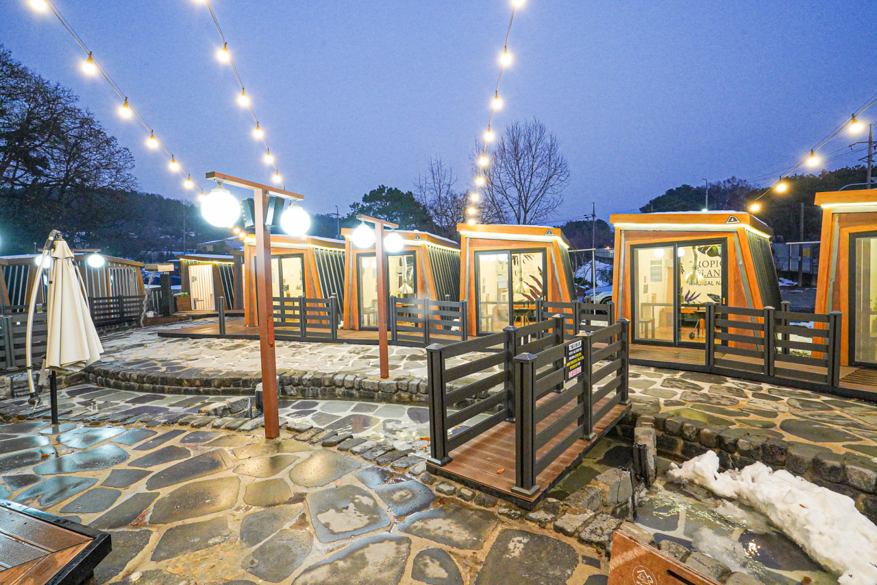 특징: 테마 캠핑 인테리어와 셀프 바베큐 시스템, 테이블 당 그릴 제공