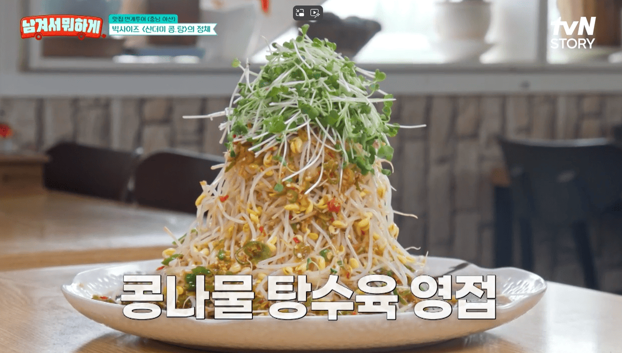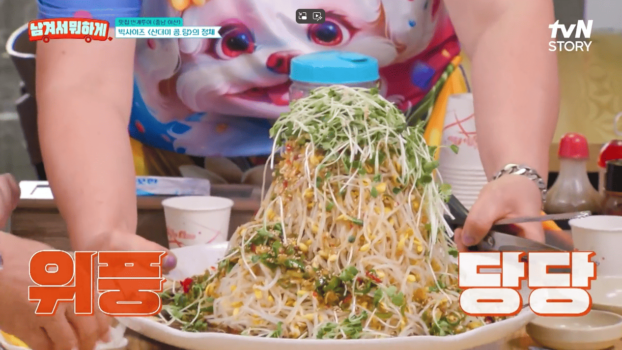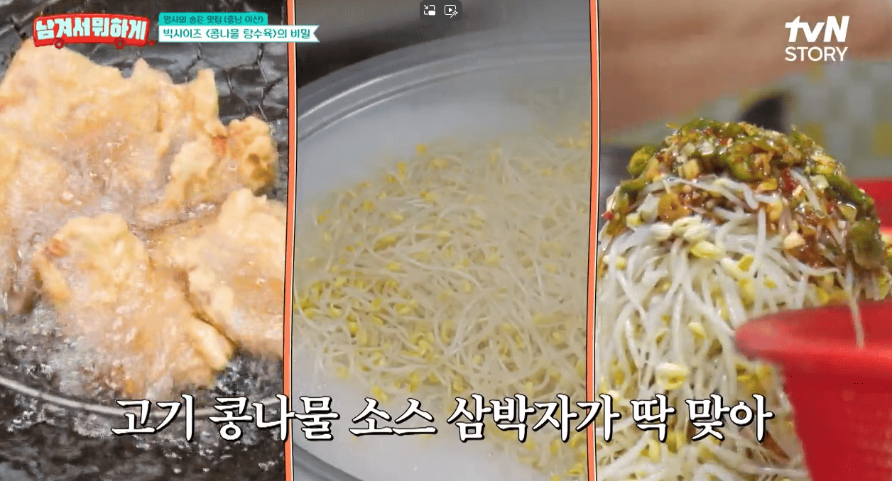 바삭한 튀김 위에 아삭아삭한 콩나물과 새콤달콤한 소스가 어우러져 식감과 맛이 정말 잘 맞는다고 하네요.