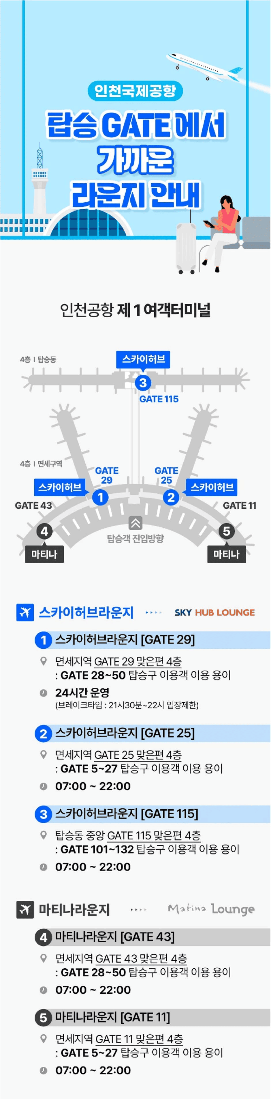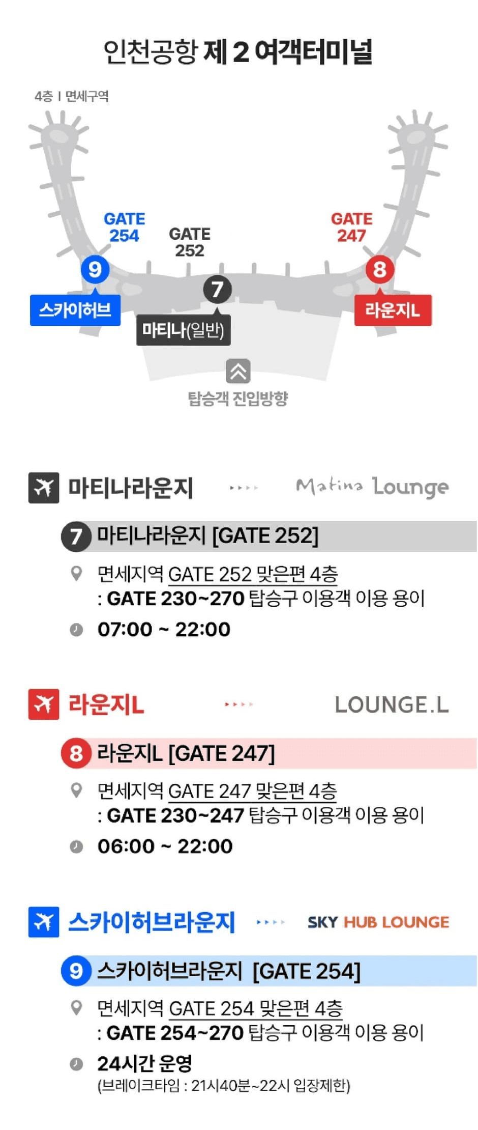 - 라운지 이용 시 항공편 탑승시간을 놓치지 않도록 탑승구까지의 거리 확인 필수