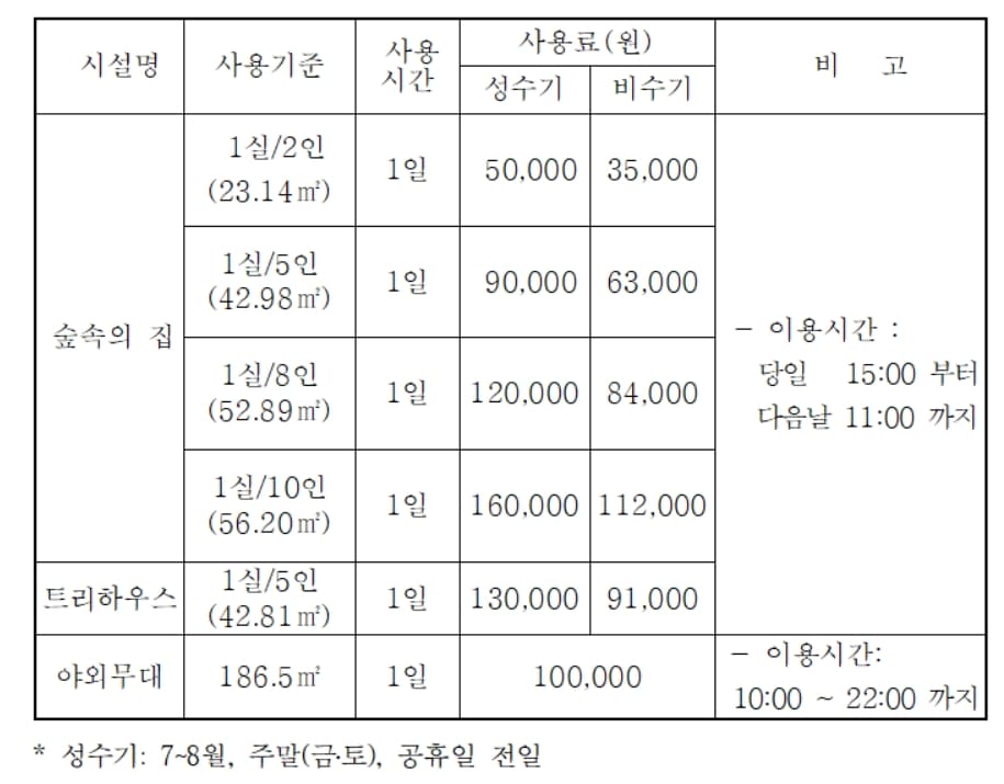 수레의산 자연휴양림은 총 15동의 숲속의 집과 3동의 산림문화휴양관을 운영하고 있으며, 주말과 성수기 요금이 상이합니다.