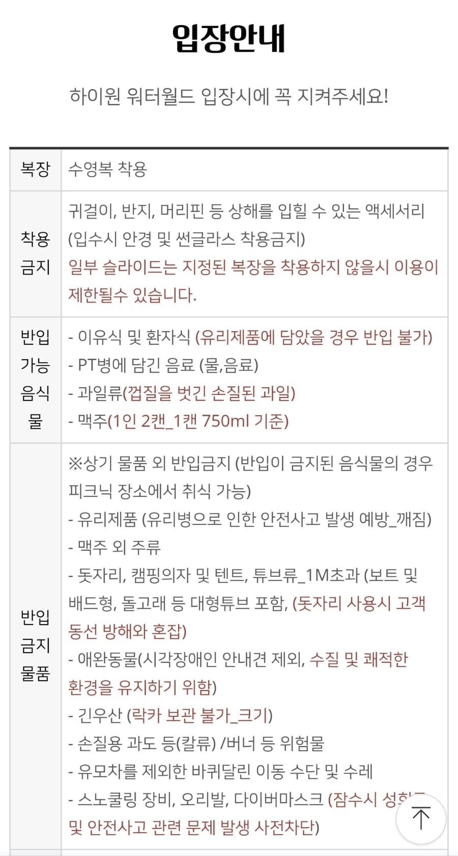 | 종일권 | 65,000원 | 55,000원 | 입장 + 모든 워터 시설 이용 |