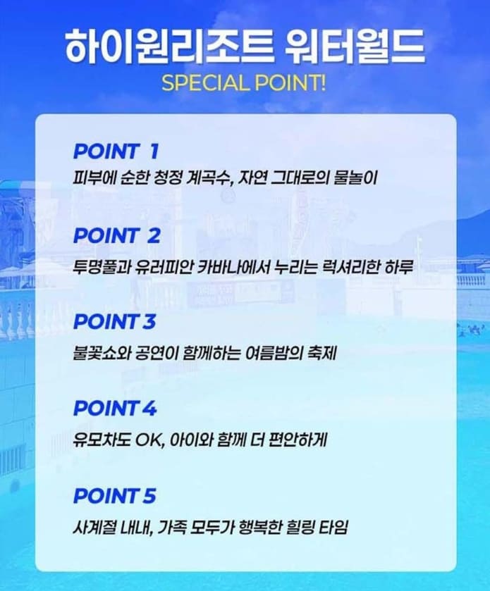 가족 단위 방문객이라면 오전에는 키즈존 위주로, 오후에는 스파존에서 휴식을 취하는 루트를 추천합니다.