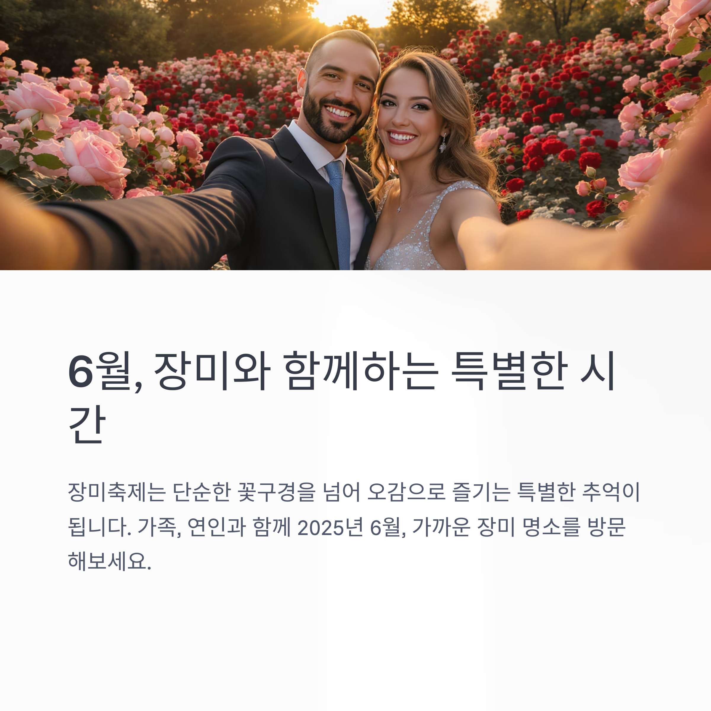6월의 장미축제는 단순한 꽃구경을 넘어 계절의 정취를 오감으로 느낄 수 있는 소중한 시간입니다. 위에서 소개한 장소들은 접근성, 행사 내용, 사진 촬영 명소 등에서 모두 높은 평가를 받고 있으며, 각 지역 관광과 연계해 하루 여행 코스로도 알차게 구성할 수 있습니다. 올 6월에는 가까운 장미 명소에서 소중한 추억을 만들어보세요.