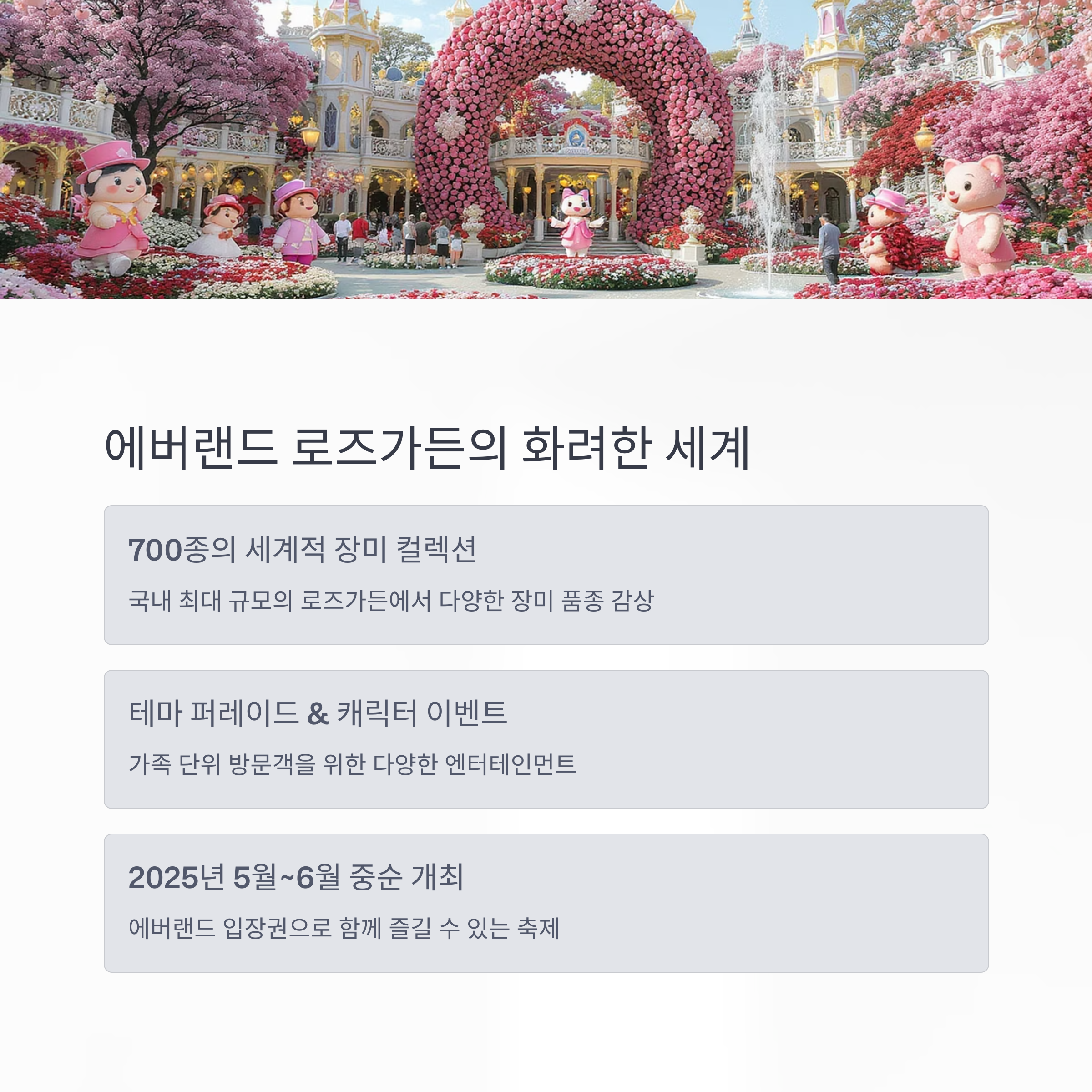 에버랜드는 매년 봄부터 초여름까지 로즈 페스티벌을 개최합니다. 약 700종의 장미가 꾸며진 로즈가든은 세계적으로도 손꼽히는 장미정원입니다. 테마 퍼레이드, 캐릭터 포토타임, 조형물 등 다양한 이벤트도 함께 즐길 수 있어 가족 단위 방문객에게 인기가 많습니다.