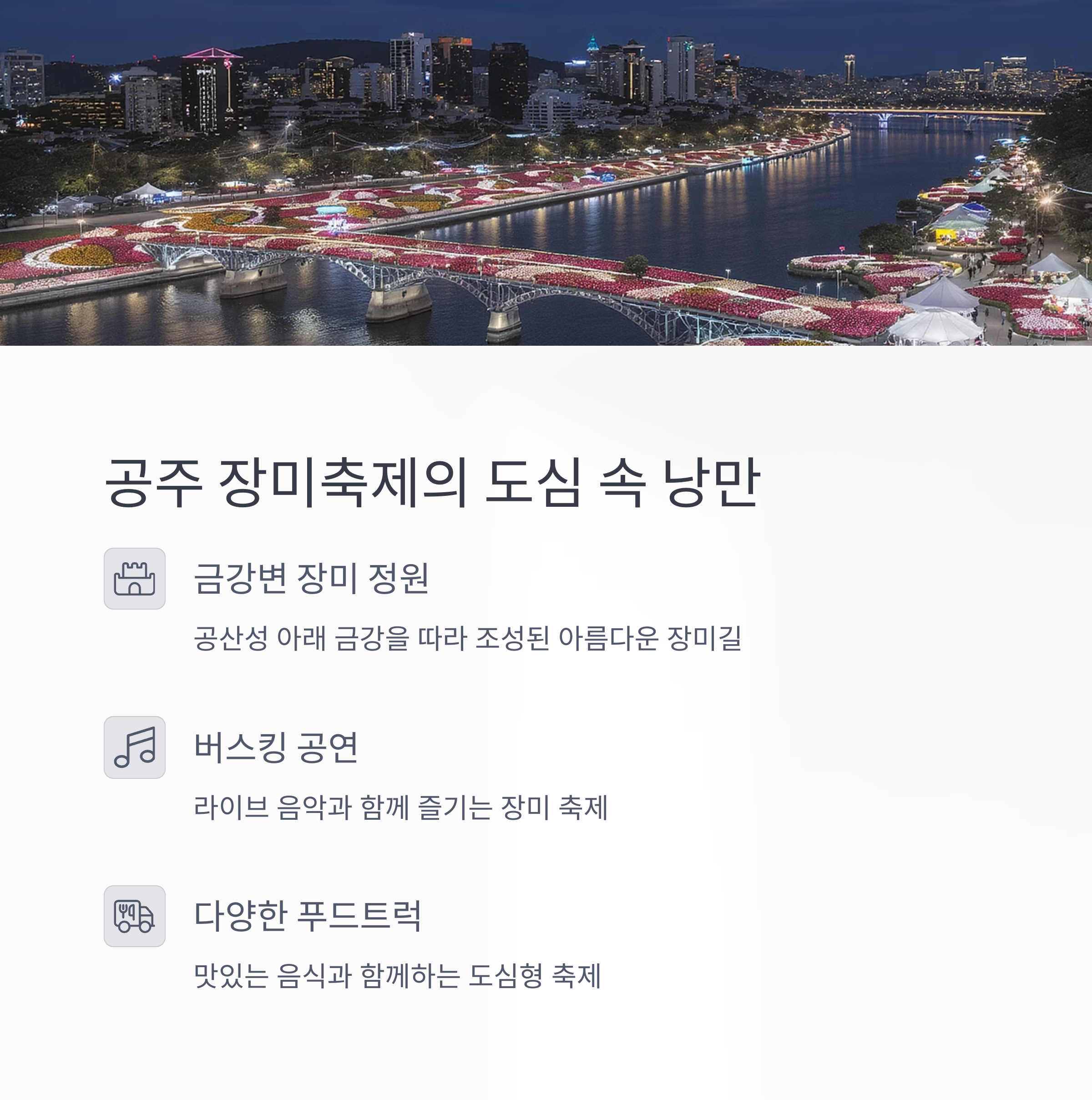 공주 장미정원은 공산성 아래 금강변을 따라 조성된 시민 공원에서 열립니다. 도시 전체가 장미 테마로 꾸며지는 이 축제는 지역 주민뿐 아니라 외지인 방문도 활발합니다. 야간 조명, 버스킹 공연, 푸드트럭 등 도심형 축제의 장점이 많습니다.