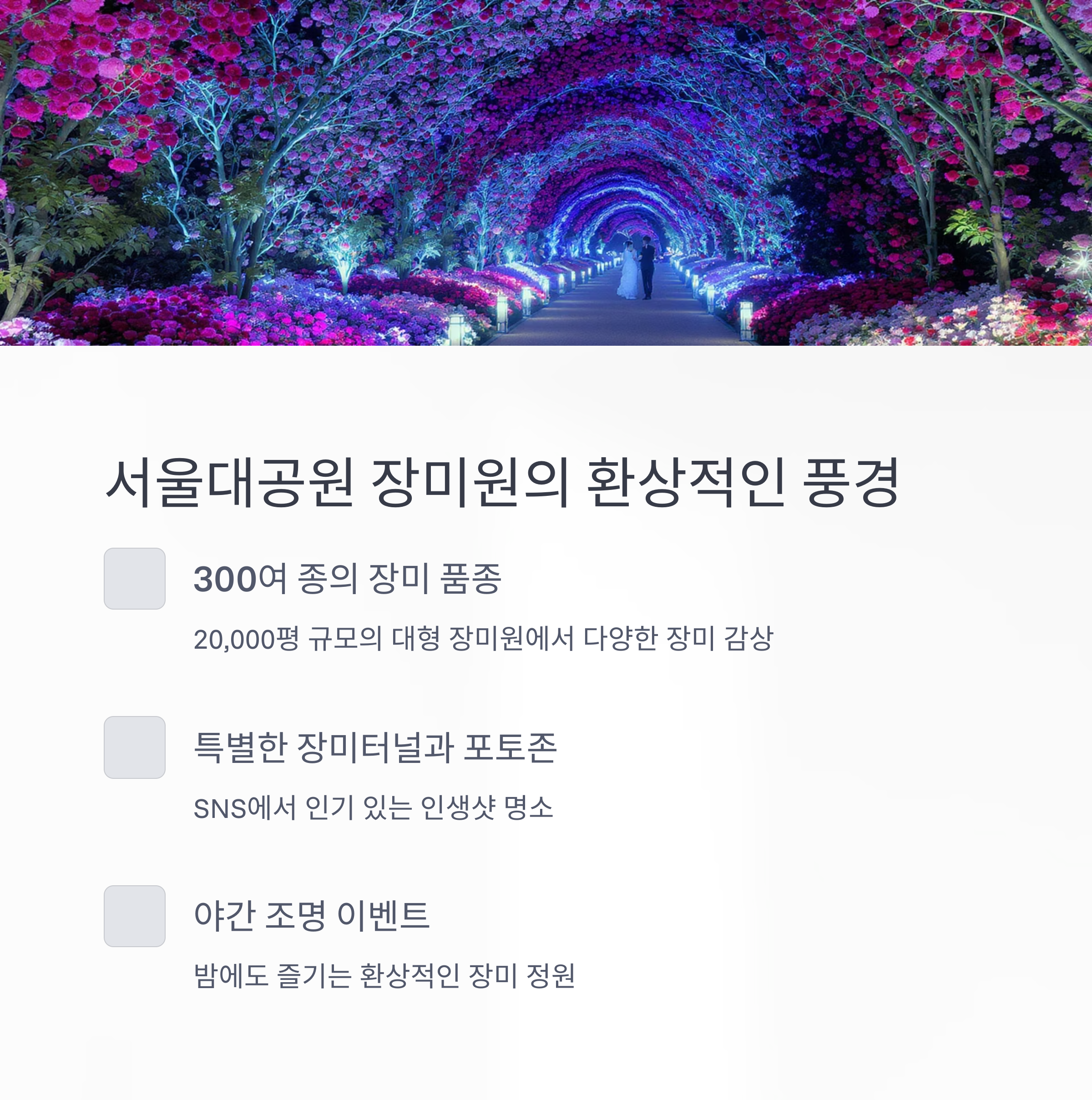 서울대공원 장미축제는 수도권에서 가장 잘 알려진 장미 명소입니다. 약 20,000평 규모의 장미원에는 300여 종의 장미가 활짝 피며, 포토존과 장미터널, 야간 조명도 함께 즐길 수 있습니다.