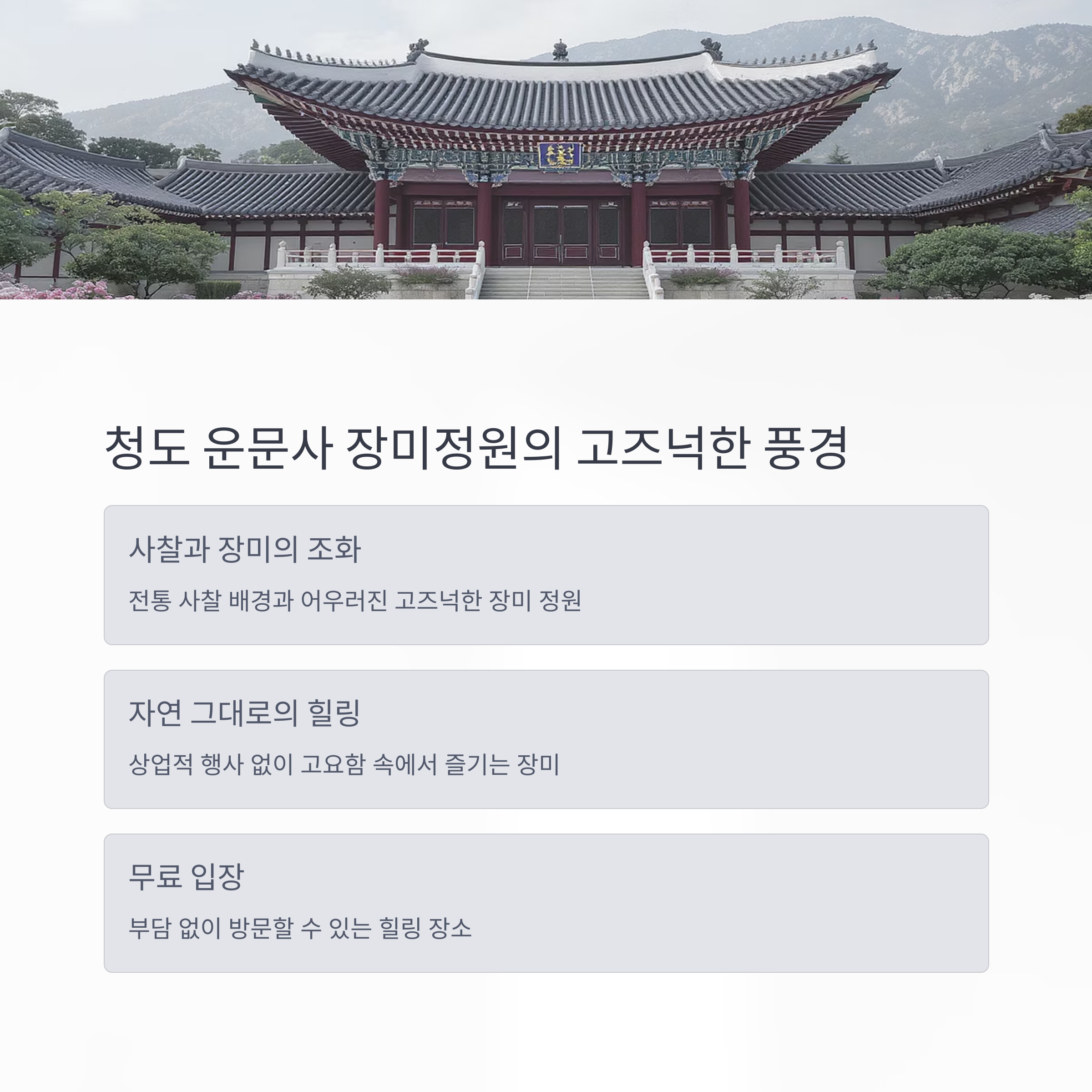 운문사는 전통 사찰로도 유명하지만, 사찰 앞 정원에 피어난 장미꽃길로 최근 입소문을 타고 있습니다. 조용한 사찰 분위기 속에서 장미의 고운 자태를 감상할 수 있어 힐링 여행지로 적합합니다. 상업적 행사보다는 자연 그대로의 분위기를 선호하는 분께 추천합니다.