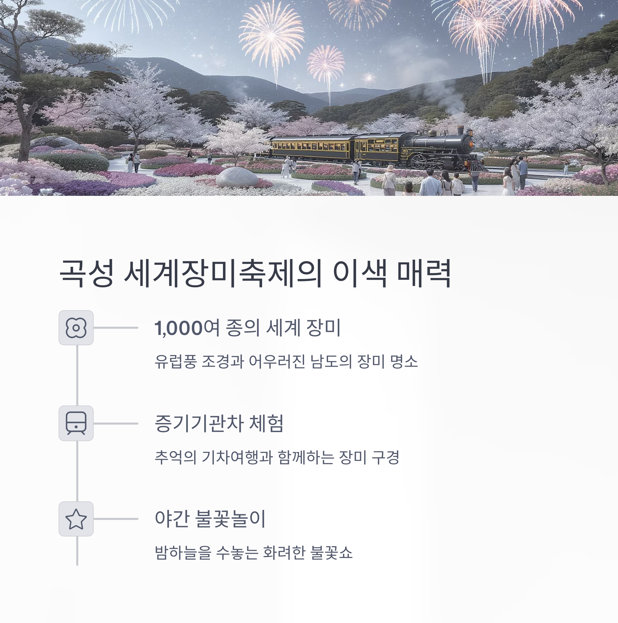 남도 대표 장미축제로 손꼽히는 곡성 세계장미축제는 곡성 기차마을 내 장미공원에서 열립니다. 유럽풍 조경과 1,000여 종의 장미꽃이 어우러져 장관을 이룹니다. 특히 증기기관차 체험, 야간 불꽃놀이 등 다양한 체험 프로그램이 마련되어 있어 아이들과 함께 방문하기 좋습니다.